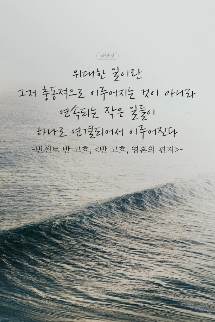 위대한 일이란 그저 충동적으로 이루어지는 것이 아니라연속되는 작은 일들이 하나로 연결되어서 이루어진다.-빈센트 반 고흐, <반 고흐, 영혼의 편지>-