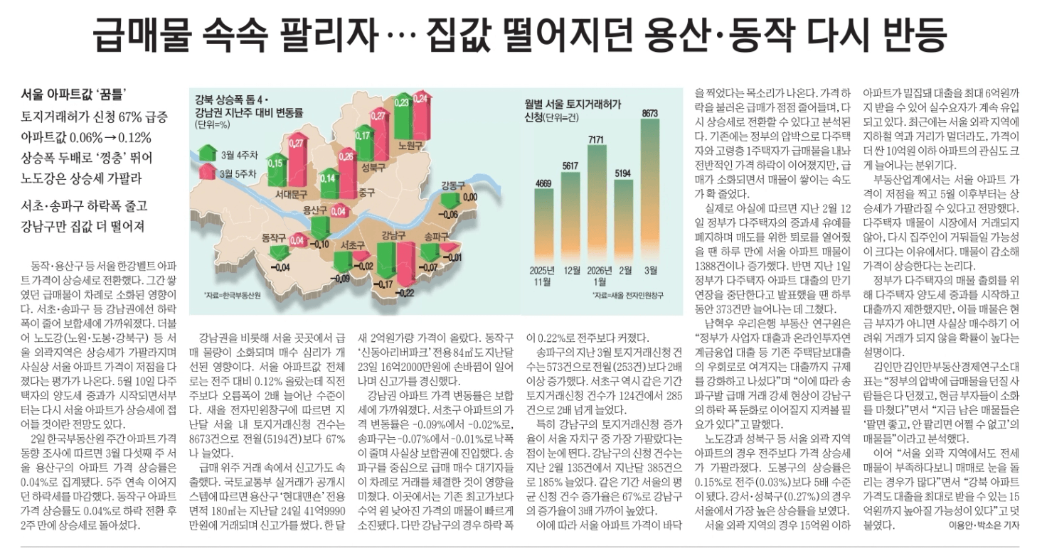 급매물 속속 팔리자 집값 떨어지던 용산, 동작 다시 반등