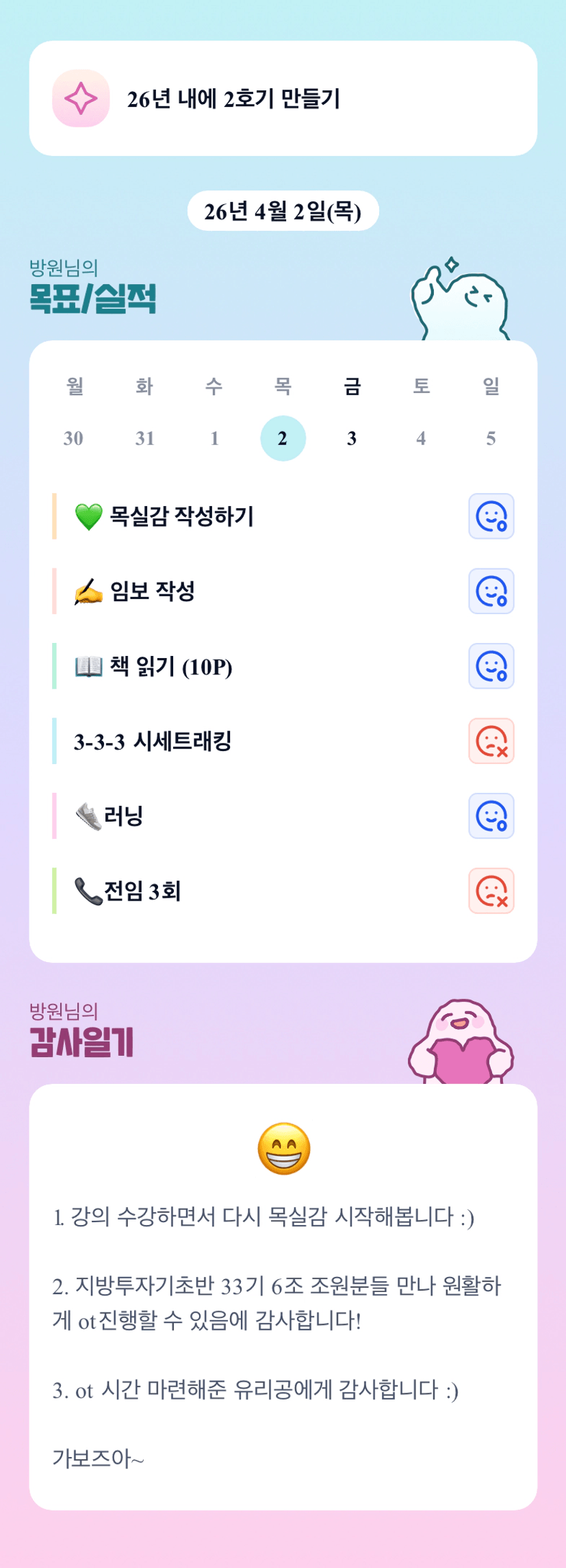 할 수 있을까 의심하는 자신에 대한 마음가짐을 확신으로 바꾸고 싶다.[방원]