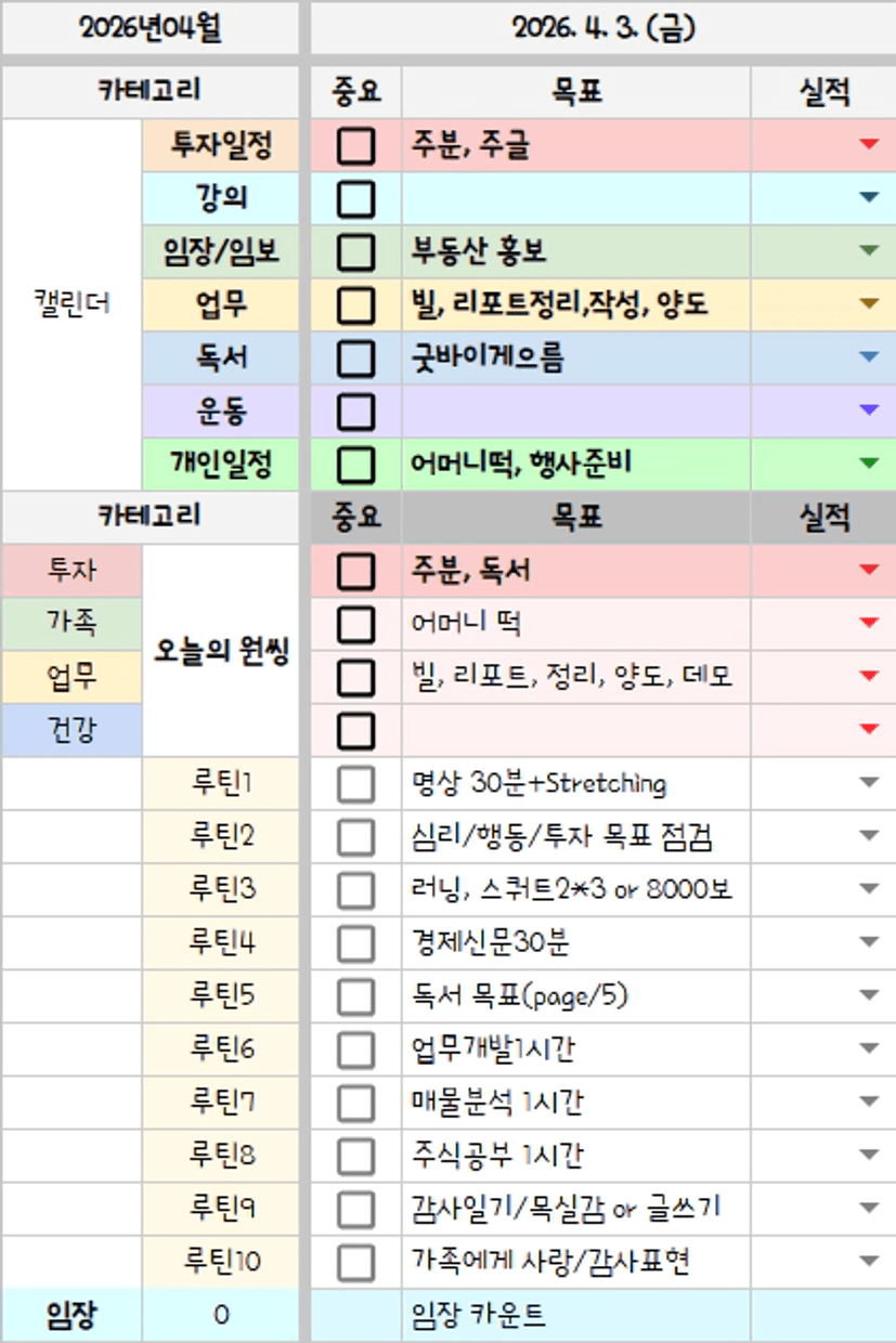 아침에 계획을 세우고 저녁에 복기를 합니다.