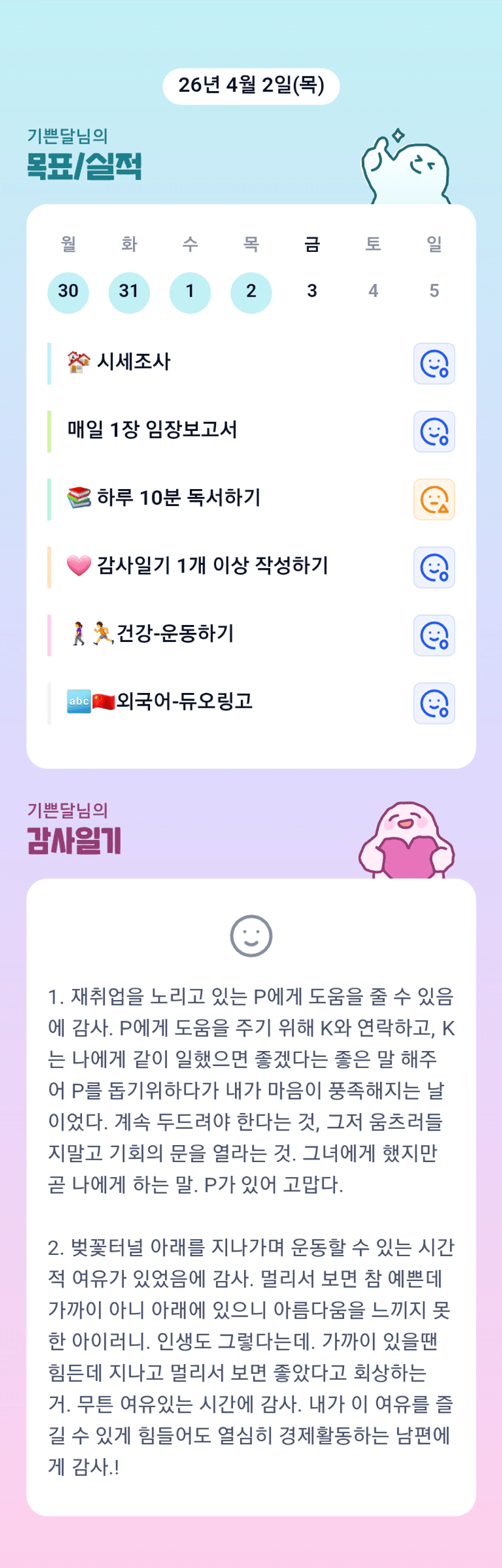 인생도 가까이 있을땐 힘든데 지나고 멀리서 보면 좋았다는 말 너무 와닿습니다! 기쁜달님 한달동안 잘 부탁드립니다🙂