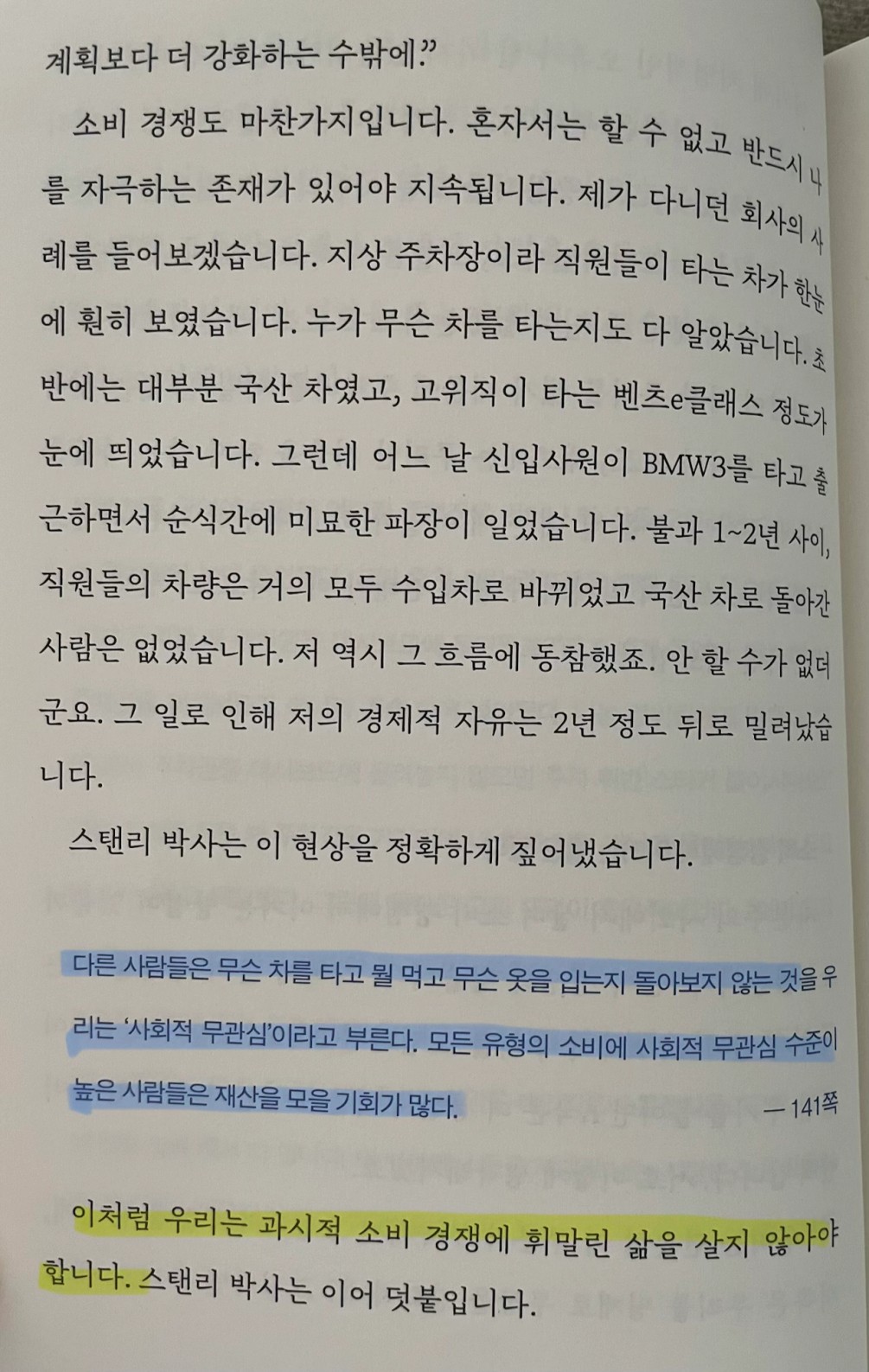 p.44 다른 사람들은 무슨 차를 타고 뭘 먹고 무슨 옷을 입는지 돌아보지 않는 것을 우리는 '사회적 무관심'이라고 부른다. 모든 유형의 소비에 사회적 무관심 수준이 높은 사람들은 재산을 모을 기회가 많다.