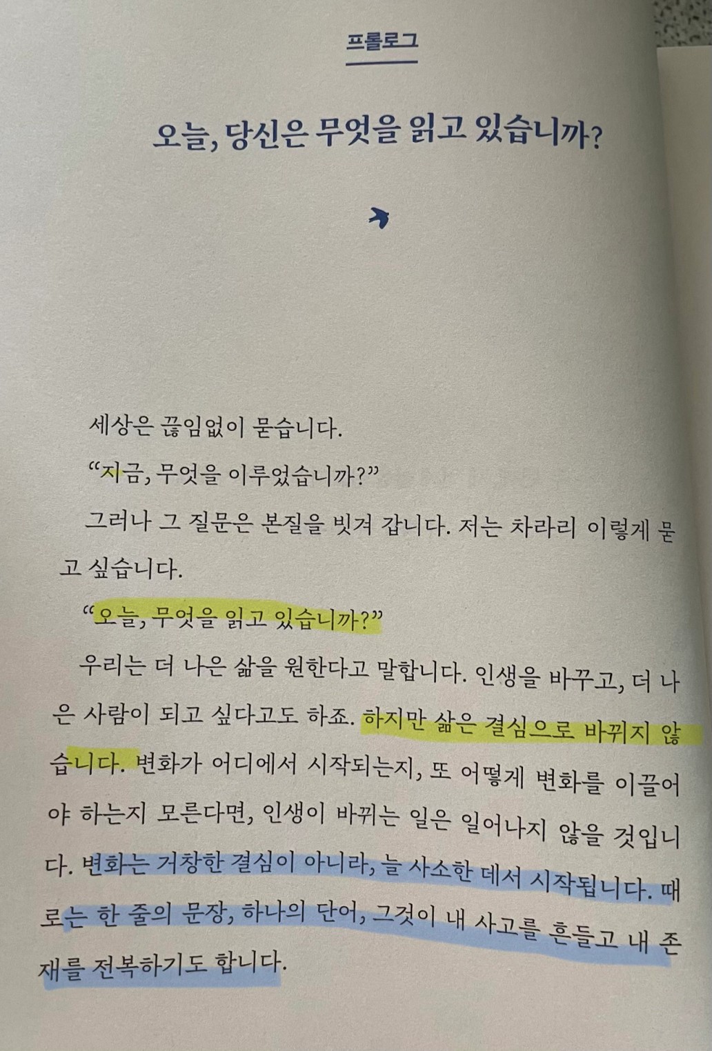 p.6 삶은 결심으로 바뀌지 않습니다. .. 변화는 거창한 결심이 아니라, 늘 사소한 데서 시작됩니다. 때로는 한 줄의 문장, 하나의 단어, 그것이 내 사고를 흔들고 내 존재를 전복하기도 합니다.