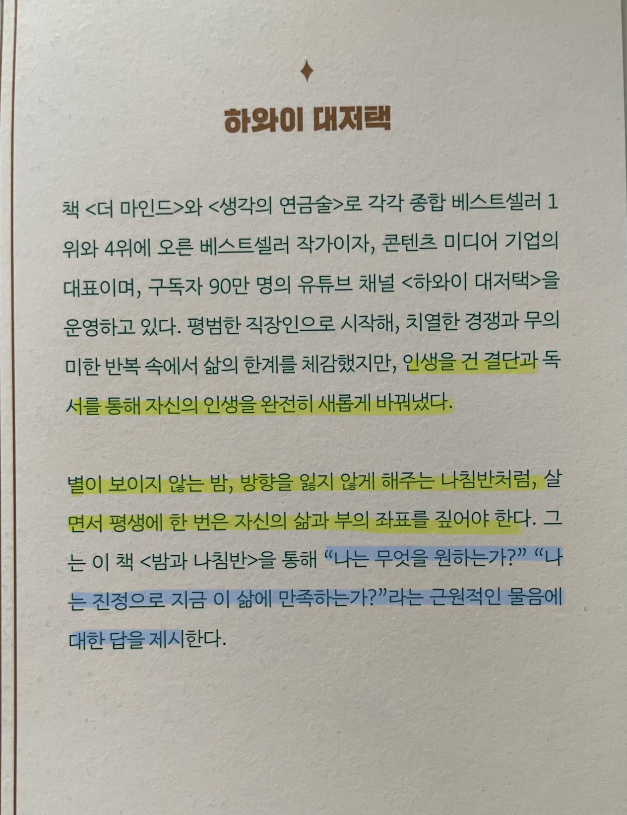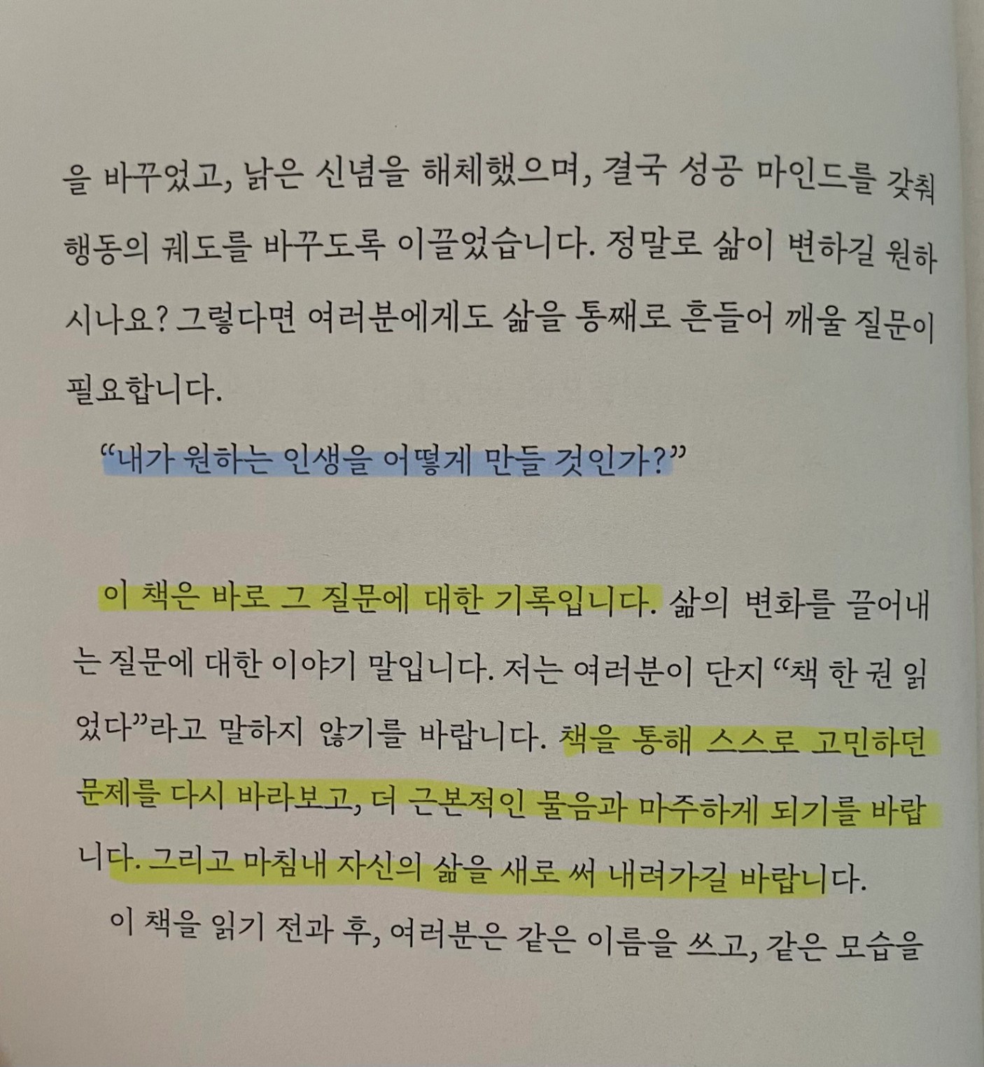 삶을 통째로 흔들어 깨울 질문, "내가 원하는 인생을 어떻게 만들 것인가?", 저자는 우리에게 이 질문을 던졌고, 그 해답의 실마리는 "오늘, 당신은 무엇을 읽고 있습니까?" 에서부터 시작된다고 말합니다. 올해 읽고 있는 여러 책에서 이 주제가 저에게 질문을 던지고 있네요. 경제적 여유를 얻고 각자 인생의 의미를 향해 가는 길에, 독서를 통해 실마리를 찾아가고 있는 이 여정, 오늘도 또 함께 화이팅 나눕니다💕