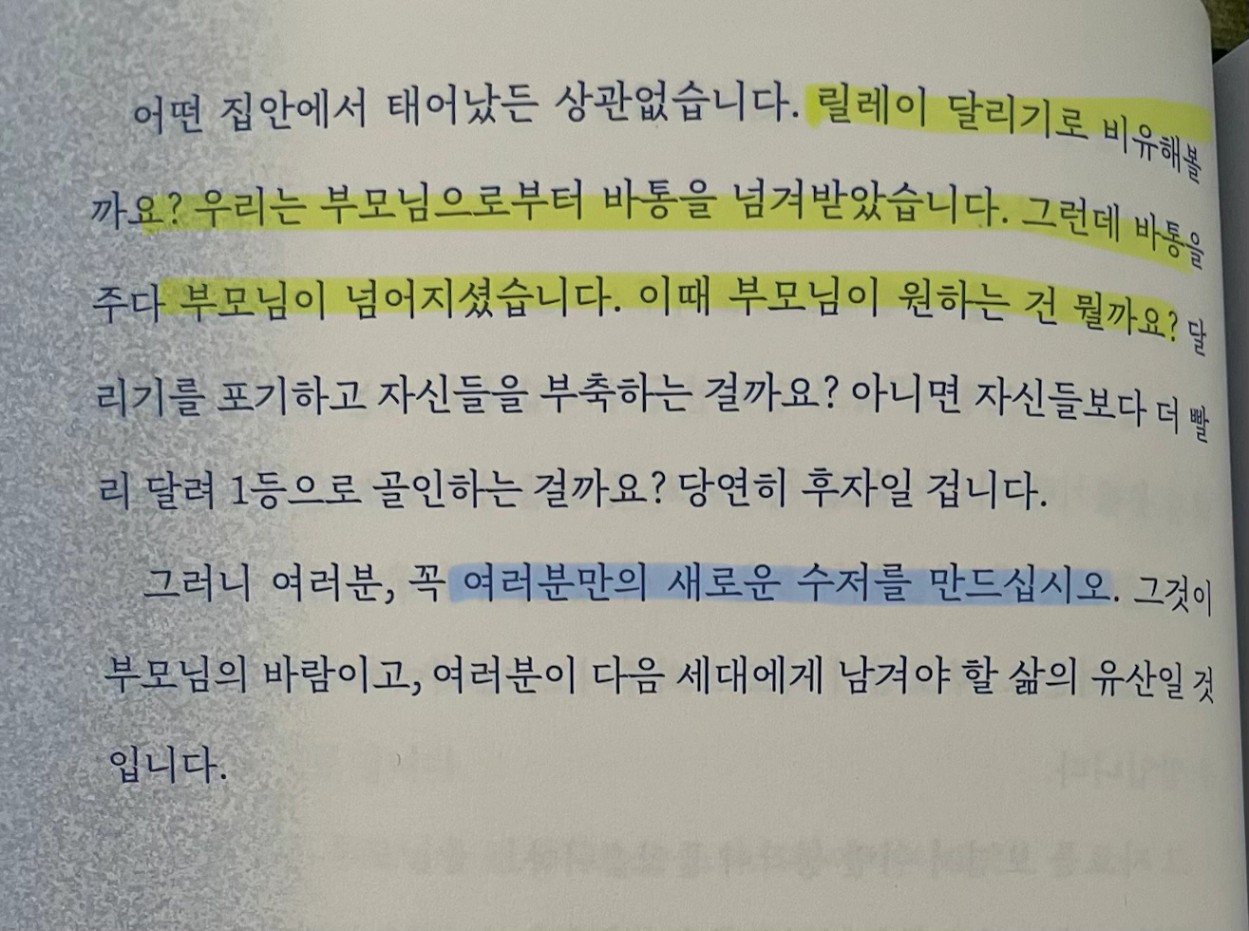 p.52 릴레이 달리기로 비유해볼까요? 우리는 부모님으로부터 바통을 넘겨받았습니다. 그런데 바통을 주다 부모님이 넘어지셨습니다. 이때 부모님이 원하는 건 뭘까요? .. 그러니 여러분, 꼭 여러분만의 새로운 수저를 만드십시오.