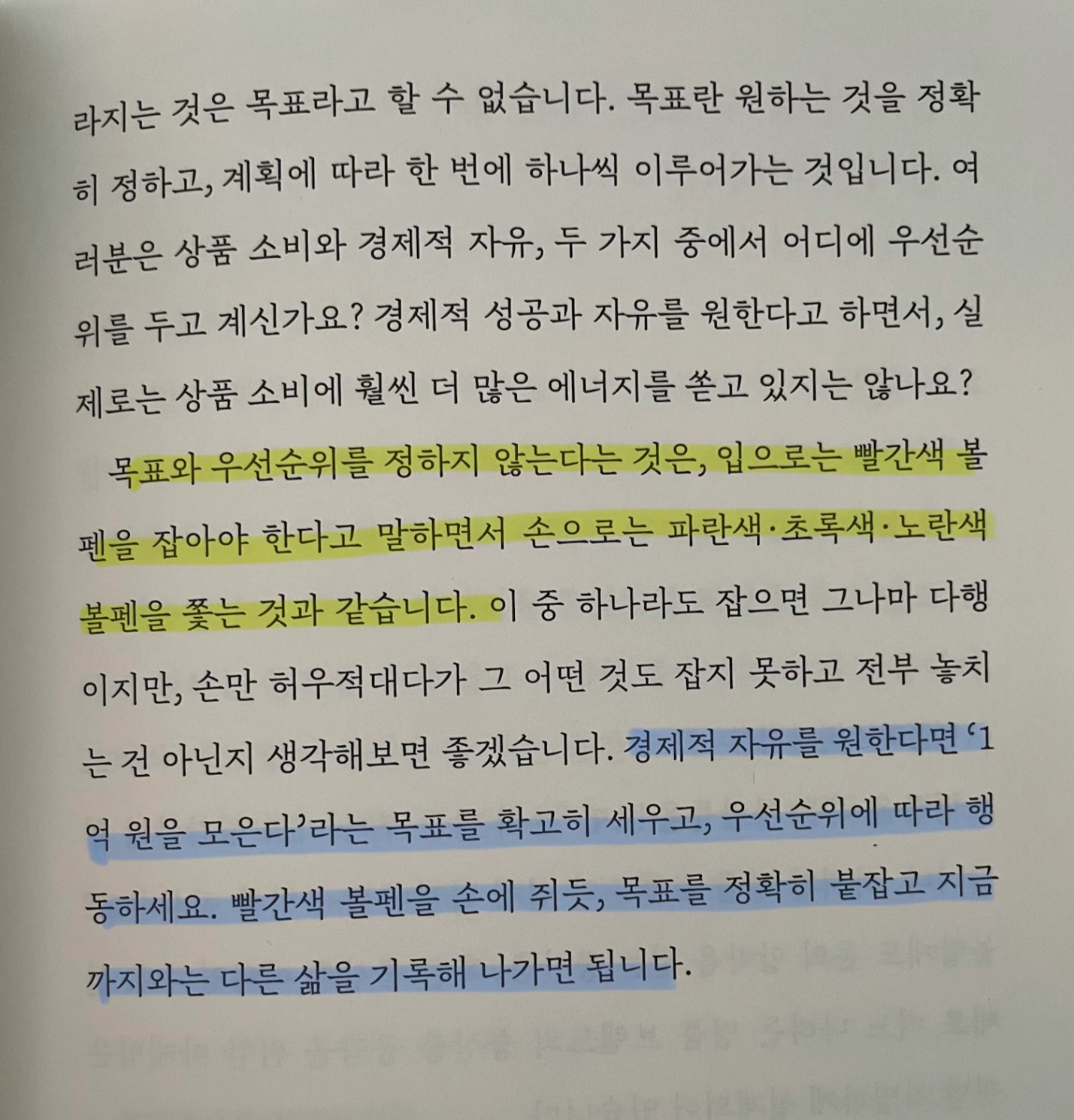 p.39 목표와 우선순위를 정하지 않는다는 것은, 입으로는 빨간색 볼펜을 잡아야 한다고 말하면서 손으로는 파란색•초록색•노란색 볼펜을 쫓는 것과 같습니다. .. 경제적 자유를 원한다면 '1억 원을 모은다'라는 목표를 확고히 세우고, 우선순위에 따라 행동하세요.