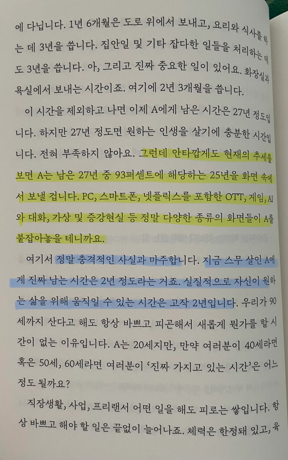 p.48 안타깝게도 현재의 추세를 보면 A는 남은 27년 중 93퍼센트에 해당하는 25년을 화면 속에서 보낼 겁니다. PC, 스마트폰, 넷플릭스를 포함한 OTT.. 여기서 정말 충격적인 사실과 마주합니다. 지금 스무 살인 A에게 진짜 남는 시간은 2년 정도라는 거죠. 실질적으로 자신이 원하는 삶을 위해 움직일 수 있는 시간은 고작 2년입니다.