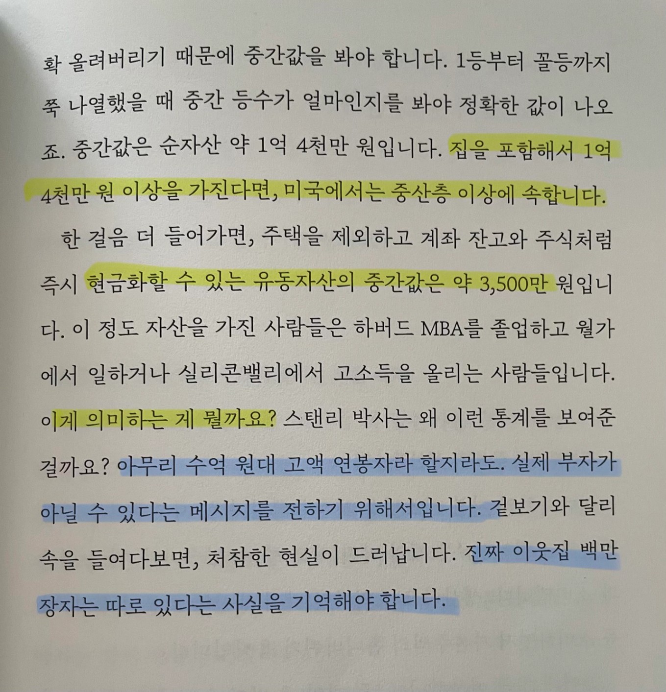 p.29 집을 포함해서 1억 4천만 원 이상을 가진다면, 미국에서는 중산층 이상에 속합니다. .. 계좌 잔고와 주식처럼 즉시 현금화할 수 있는 유동자산의 중간값은 약 3,500만 원입니다. ..스탠리 박사는 왜 이런 통계를 보여준 걸까요? 아무리 수억 원대 고액 연봉자라 할지라도 실제 부자가 아닐 수 있다는 메시지를 전하기 위해서입니다.