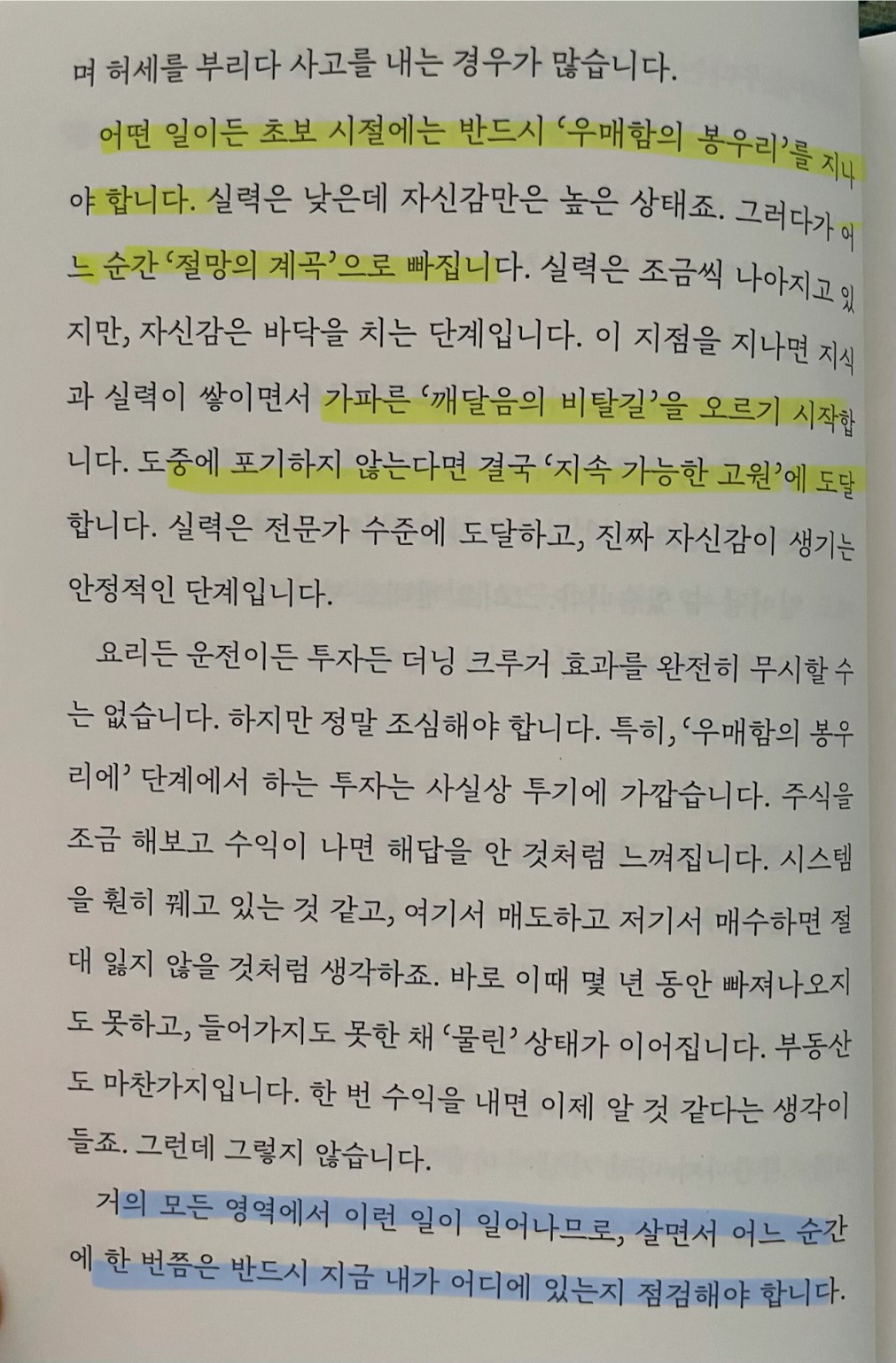p.22 거의 모든 영역에서 이런 일이 일어나므로(더닝 크루거 효과), 살면서 어느 순간에 한 번쯤은 반드시 지금 내가 어디에 있는지 점검해야 합니다.