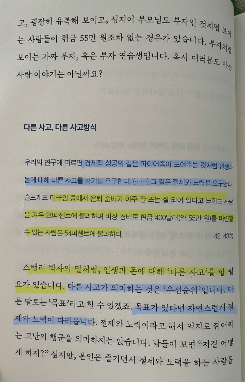 p.32 스탠리 박사의 말처럼, 인생과 돈에 대해 '다른 사고'를 할 필요가 있습니다. 다른 사고가 의미하는 것은 '우선순위'입니다. .. 목표가 있다면 자연스럽게 절제와 노력이 따라옵니다.
