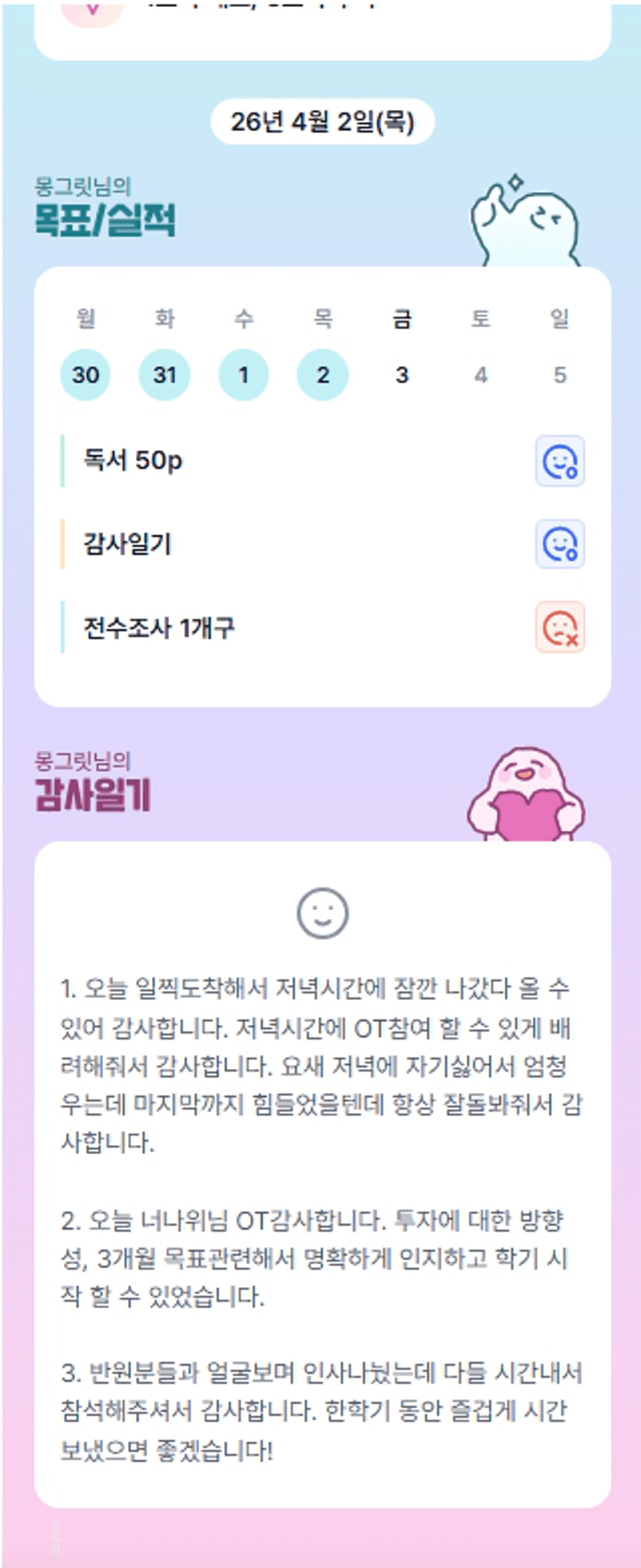 몽부님~ 반OT로 만나뵈어서 너무 반가웠습니다!! 잘 부탁드려요. ㅎㅎ