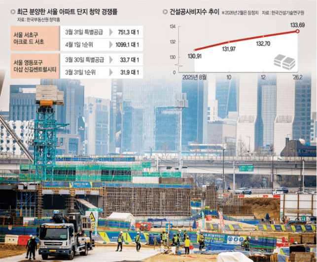 - 미국 이란 전쟁의 영향으로 공사비가 엄청 오르고 있습니다. 앞으로 공사비 상승으로 인해 집값이 상승할 것이라는 요인으로 인해 청약경쟁률이 올라가는 현상도 있네요.