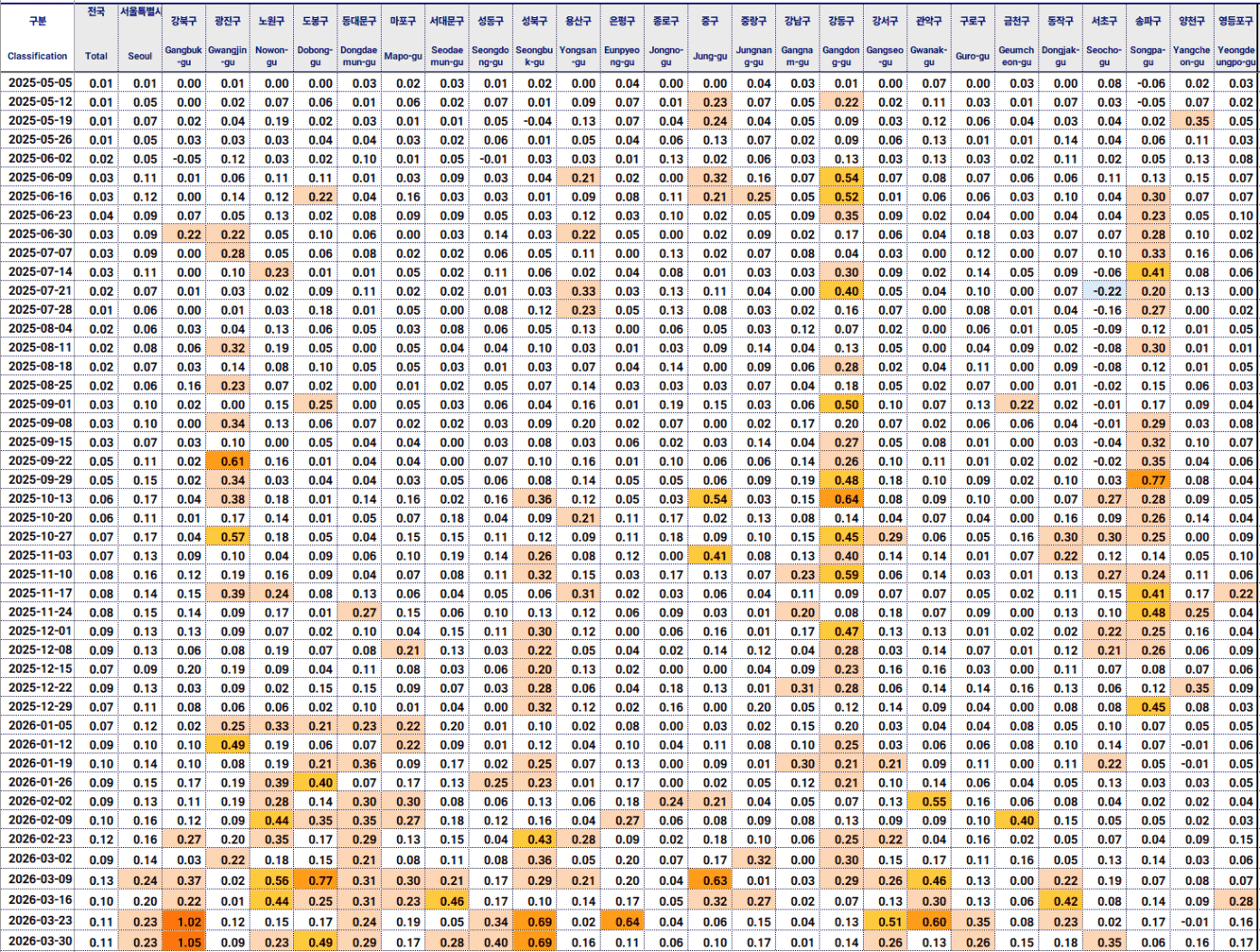 서울의 경우 동대문구, 강동구, 강서구, 영등포구, 성동구