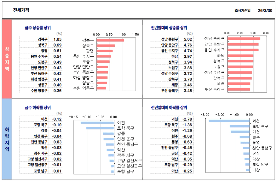 서울,경기 모두 지난주와 같은 수준으로 상승했습니다.