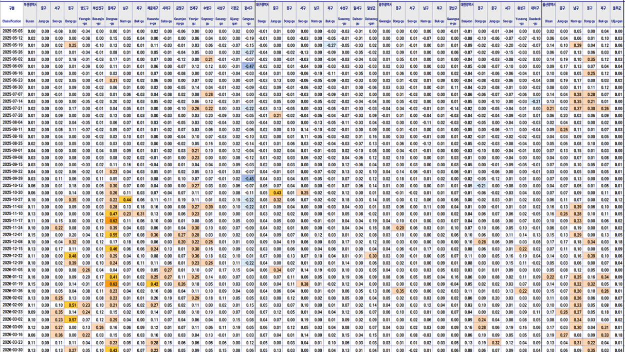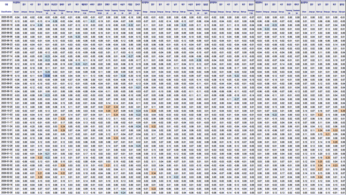 부산은 지난주와 비슷한 상승률을 보여주고 있으며