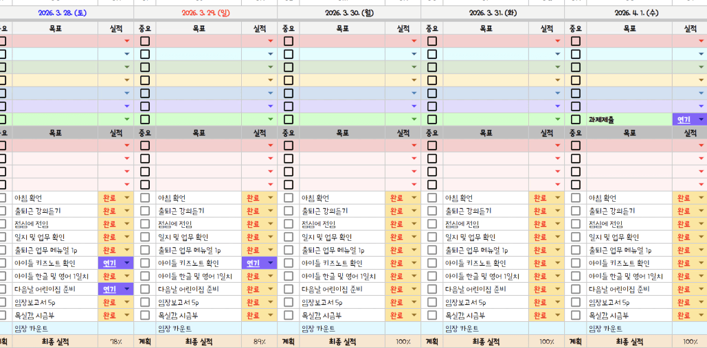예) 토요일부터 목요일까지 목실감을 쭉 하루하루 적어보면서 스스로 중요한 부분은 놓치지 않고 해낸 것 같아 뿌듯하다.