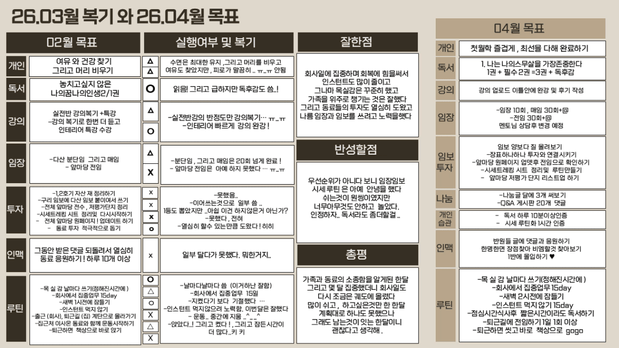 26년 정말 널널히 쉬엇던 3월 복기와 정신바짝 차려야하는 4월 목표 입니다 !