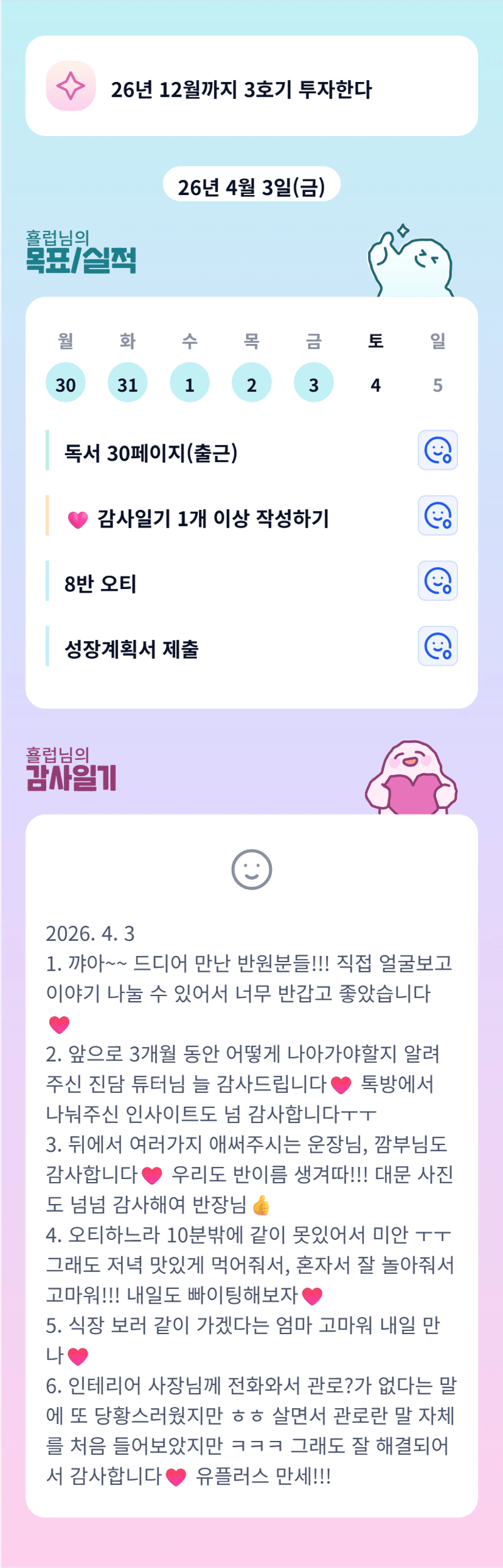 횰럽님의 밝은 에너지가 느껴지는 감사일기네요! 월부학교 화이팅입니다!