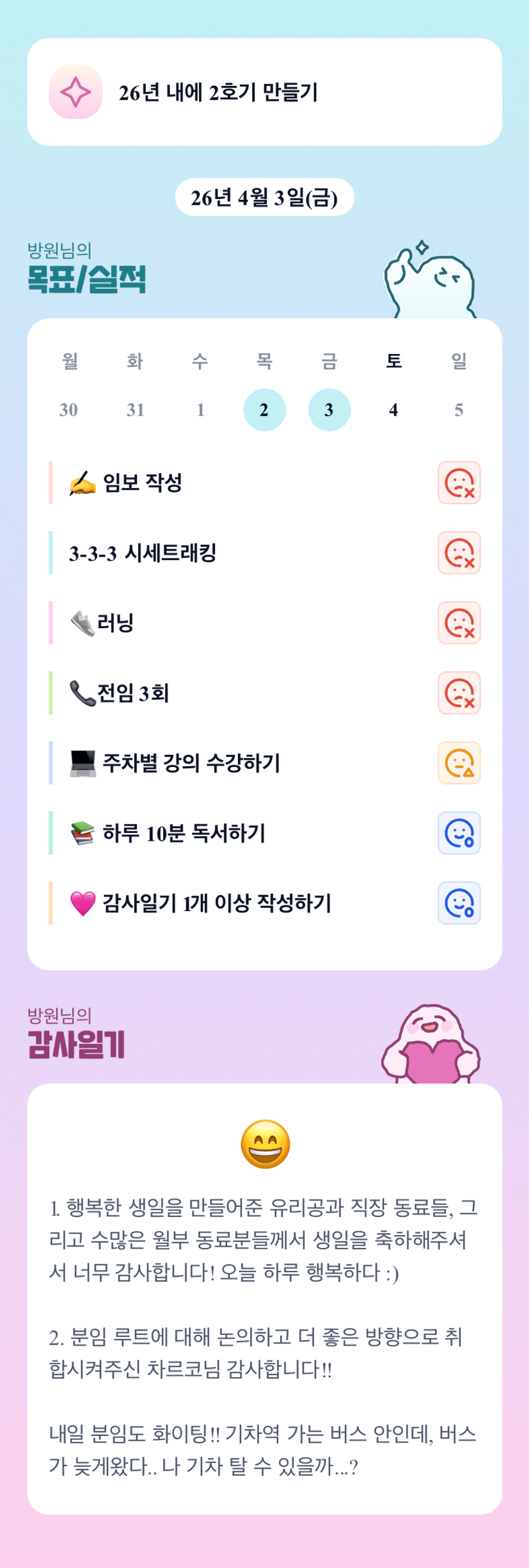 할 수 있을까 의심하는 자신에 대한 마음가짐을 확신으로 바꾸고 싶다.[방원]