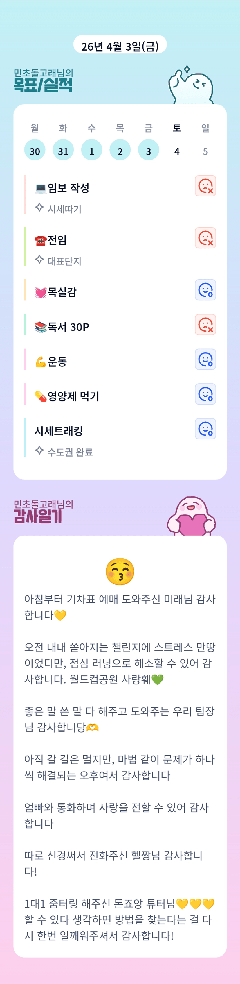 어우 민초님 감일에 출현하다니 감사합니다. 하이님 바쁘지만 해내가시는 모습보며 나도 해내가야지 라는 생각하는거 아시나유. 우리 서로 챙기면서 한달 보내봐요 ~. ㅋㅋ 잘부탁드립니다.