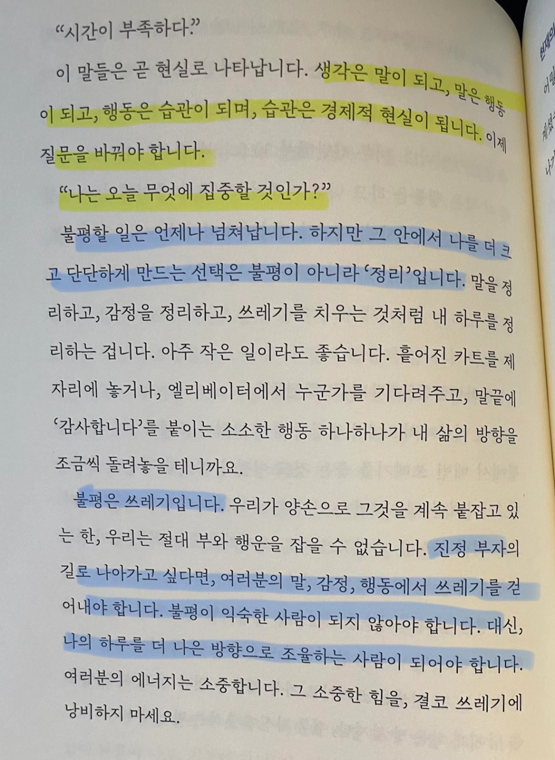 p.86 불평은 쓰레기입니다. .. 진정 부자의 길로 나아가고 싶다면, 여러분의 말, 감정, 행동에서 쓰레기를 걷어내야 합니다. 불평이 익숙한 사람이 되지 않아야 합니다. 대신, 나의 하루를 더 나은 방향으로 조율하는 사람이 되어야 합니다.