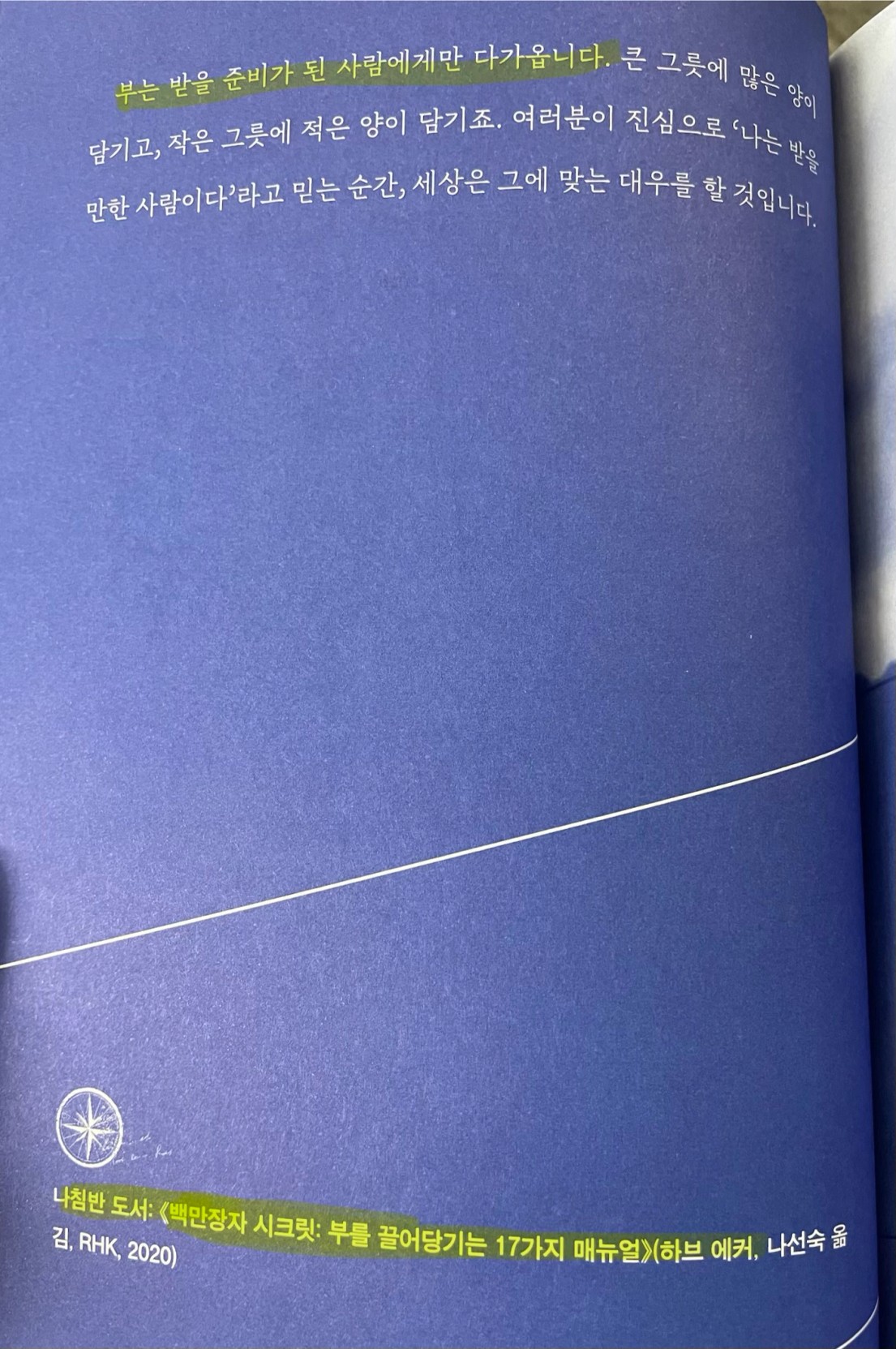 오늘 읽은 부분은 저자가 하브 에커의 <백만장자 시크릿> 책을 인용했네요. '돈을 공부하면서 저는 '나 자신'을 공부했습니다. 돈은 열매였고, 그 뿌리는 나 자신이었습니다.' 저 역시 그렇게 느꼈던 부분이라 완전 공감됩니다! 오늘의 한 문장, 나 자신을 최고의 우량주로 만든다! 🤩 오늘도 화이팅💕