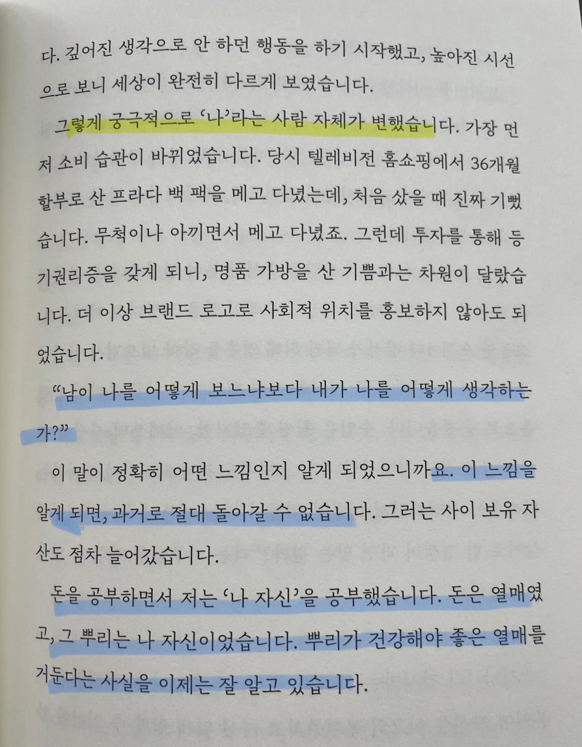 p.61 "남이 나를 어떻게 보느냐보다 내가 나를 어떻게 생각하는가?".. 이 느낌을 알게 되면, 과거로 절대 돌아갈 수 없습니다. .. 돈을 공부하면서 저는 '나 자신'을 공부했습니다. 돈은 열매였고, 그 뿌리는 나 자신이었습니다.