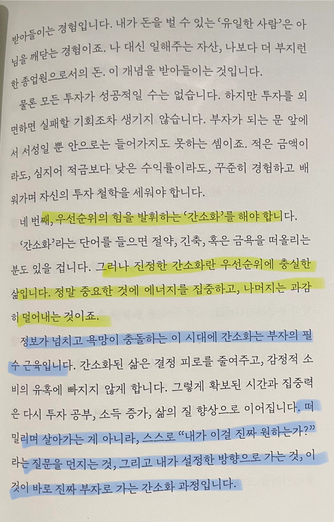 p.77 진정한 간소화란 우선순위에 충실한 삶입니다. 정말 중요한 것에 에너지를 집중하고, 나머지는 과감히 덜어내는 것이죠. 정보가 넘치고 욕망이 충돌하는 이 시대에 간소화는 부자의 필수 근육입니다. .. 떠밀리며 살아가는 게 아니라, 스스로 "내가 이걸 진짜 원하는가?"라는 질문을 던지는 것, 그리고 내가 설정한 방향으로 가는 것, 이것이 바로 진짜 부자로 가는 간소화 과정입니다.