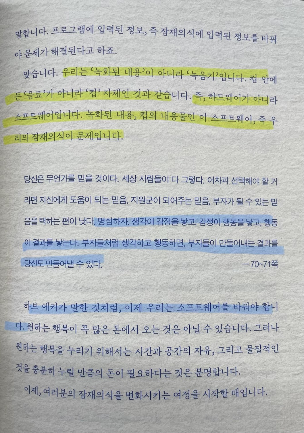 p.57 우리는 '녹화된 내용'이 아니라 '녹음기'입니다. ..즉, 하드웨어가 아니라 소프트웨어입니다. 녹화된 내용, 컵의 내용물인 이 소프트웨어, 즉 우리의 잠재의식이 문제입니다. .. 명심하자. 생각이 감정을 낳고, 감정이 행동을 낳고, 행동이 결과를 낳는다. 부자들처럼 생각하고 행동하면, 부자들이 만들어내는 결과를 당신도 만들어낼 수 있다. 하브 에커가 말한 것처럼, 이제 우리는 소프트웨어를 바꿔야 합니다.