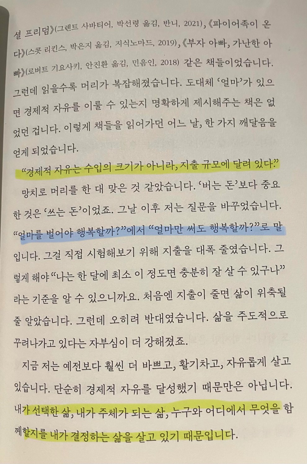 p.67 "경제적 자유는 수입의 크기가 아니라, 지출 규모에 달려 있다." .. 그날 이후 저는 질문을 바꾸었습니다. "얼마를 벌어야 행복할까?" 에서 "얼마만 써도 행복할까?"로 말입니다.