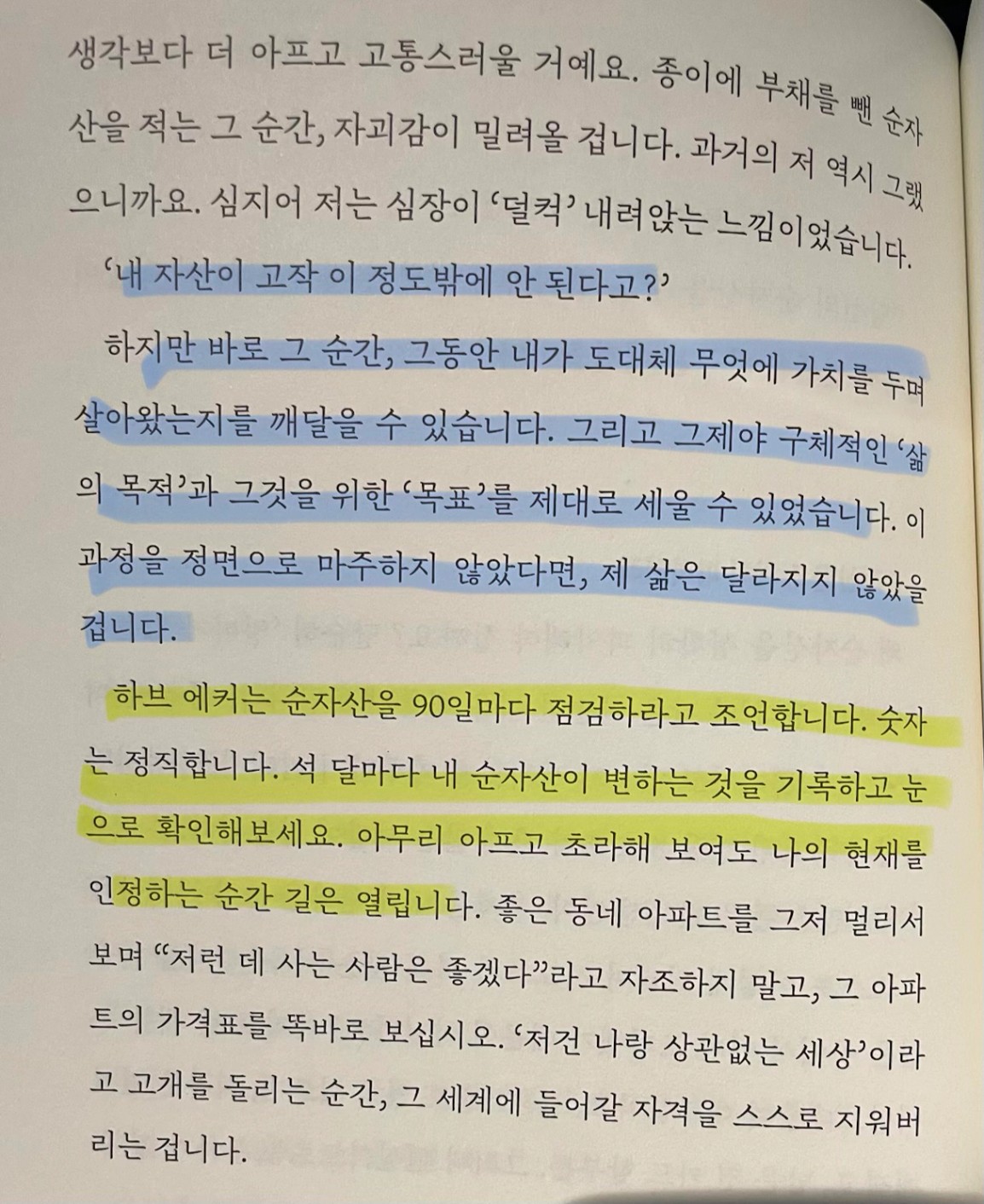 p.74 하브 에커는 순자산을 90일마다 점검하라고 조언합니다. 숫자는 정직합니다. 석 달마다 내 순자산이 변하는 것을 기록하고 눈으로 확인해보세요. 아무리 아프고 초라해 보여도 나의 현재를 인정하는 순간 길은 열립니다.