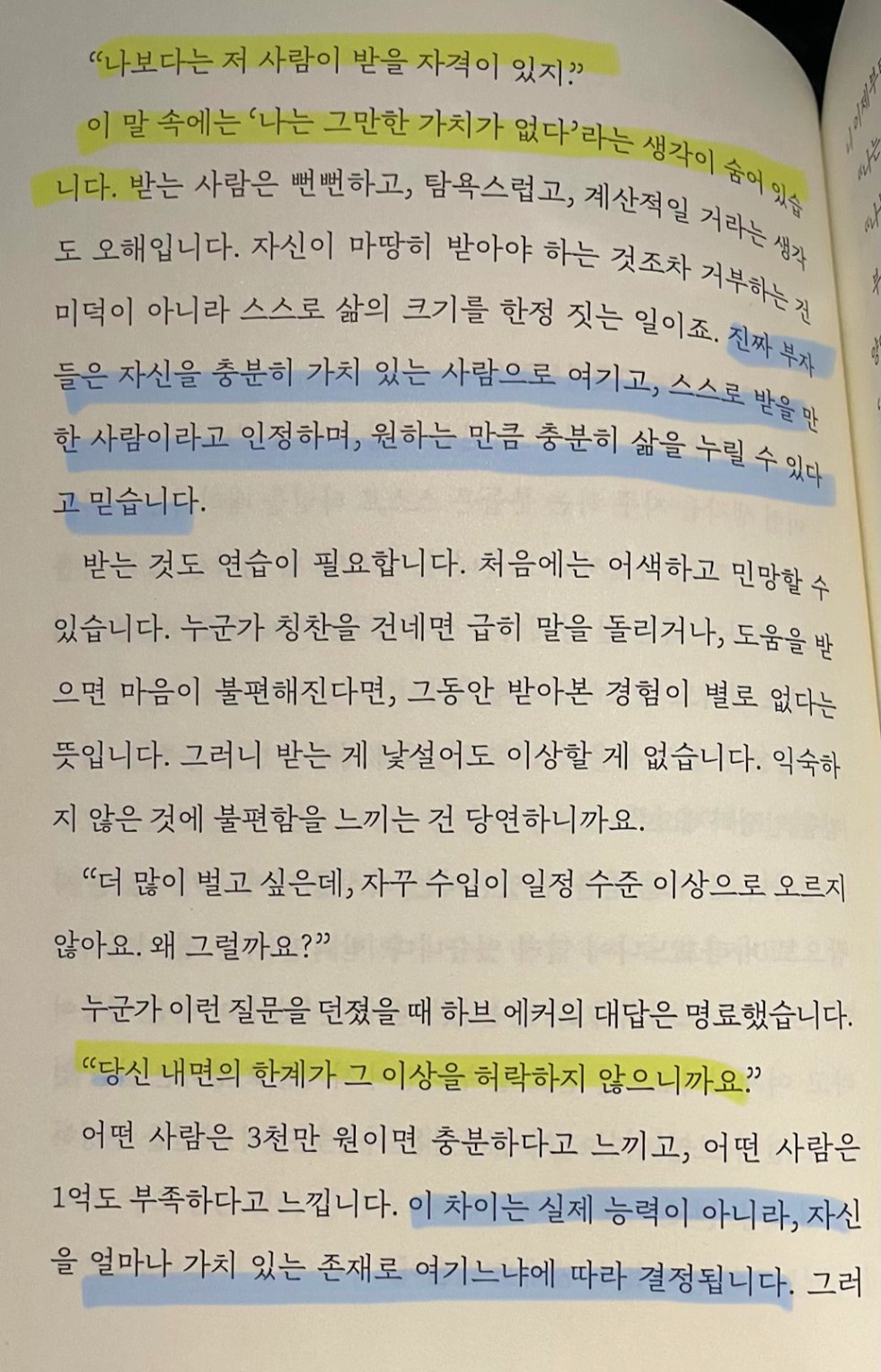 p.82 "나보다는 저 사람이 받을 자격이 있지." 이 말 속에는 '나는 그만한 가치가 없다'라는 생각이 숨어 있습니다. ..진짜 부자들은 자신을 충분히 가치 있는 사람으로 여기고, 스스로 받을 만한 사람이라고 인정하며, 원하는 만큼 충분히 삶을 누릴 수 있다고 믿습니다.