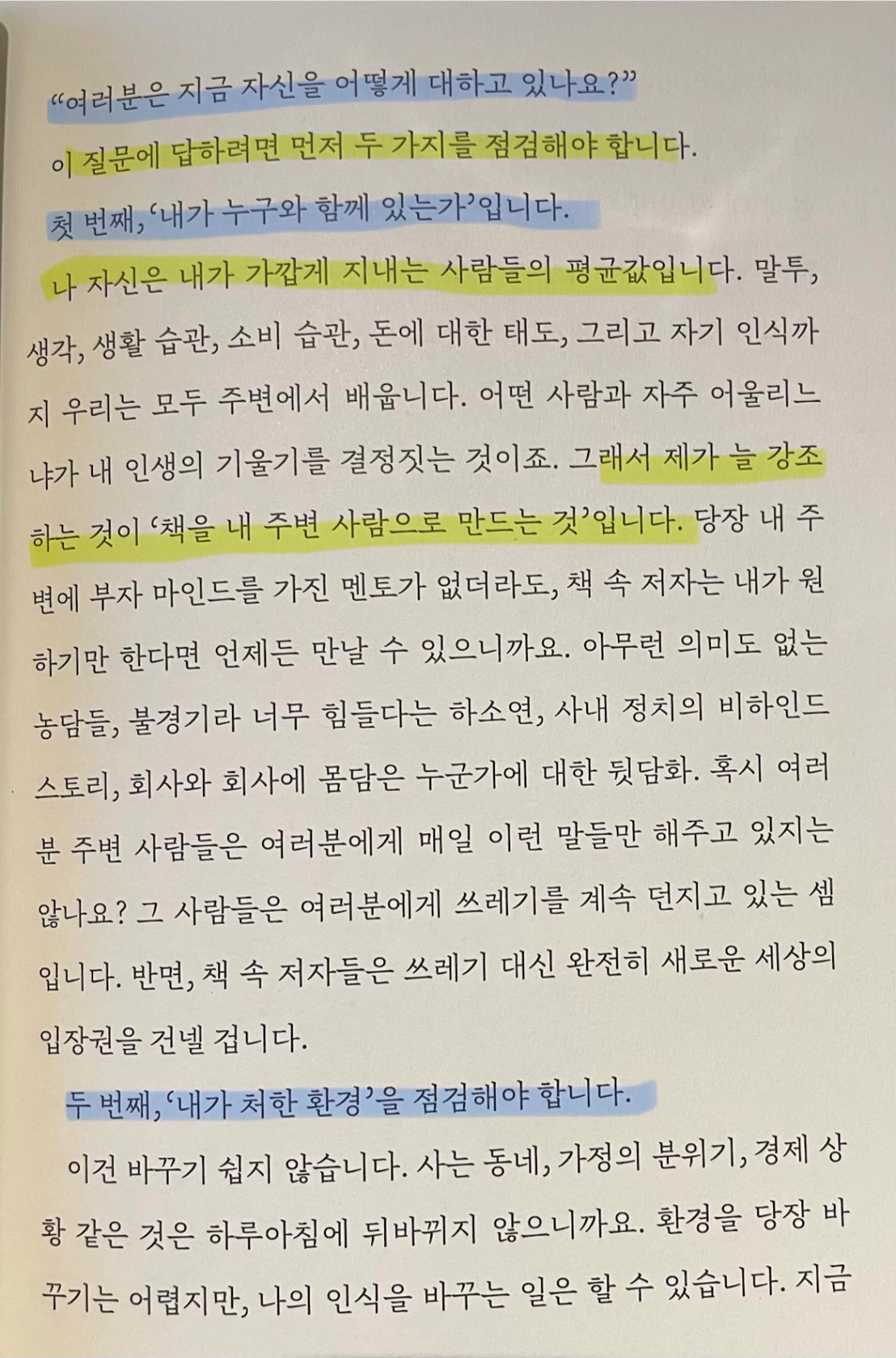 p.89 "여러분은 지금 자신을 어떻게 대하고 있나요?" 이 질문에 답하려면 먼저 두 가지를 점검해야 합니다. 첫 번째, '내가 누구와 함께 있는가'입니다. 나 자신은 내가 가깝게 지내는 사람들의 평균값입니다. .. 두 번째, '내가 처한 환경'을 점검해야 합니다.