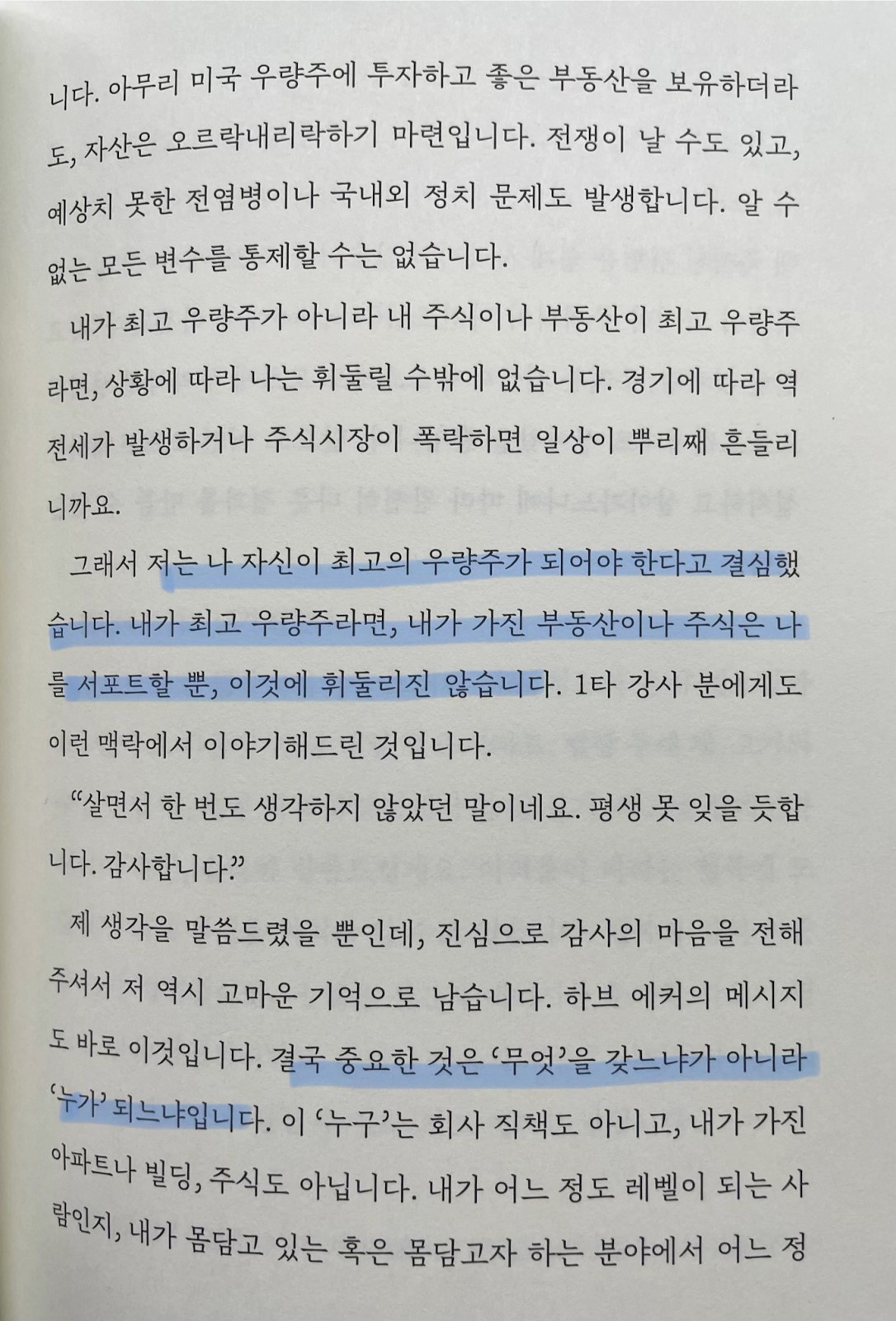 -내가 최고 우량주라면, 내가 가진 부동산이나 주식은 나를 서포트할 뿐, 이것에 휘둘리진 않습니다. 결국 중요한 것은 '무엇'을 갖느냐가 아니라 '누가' 되느냐입니다.