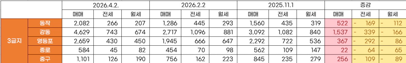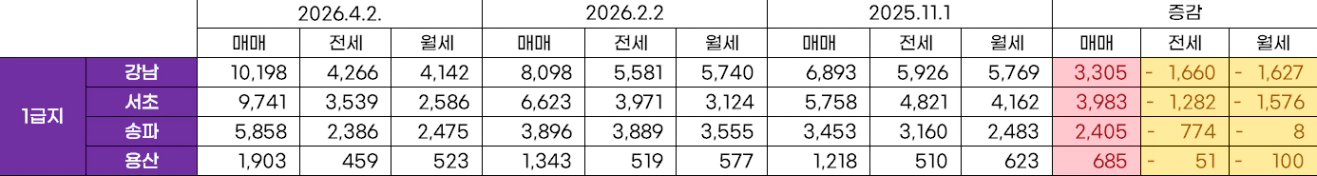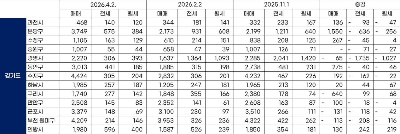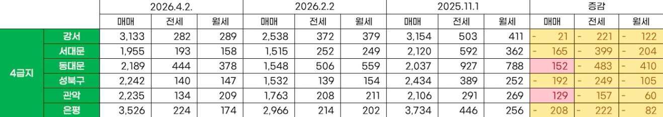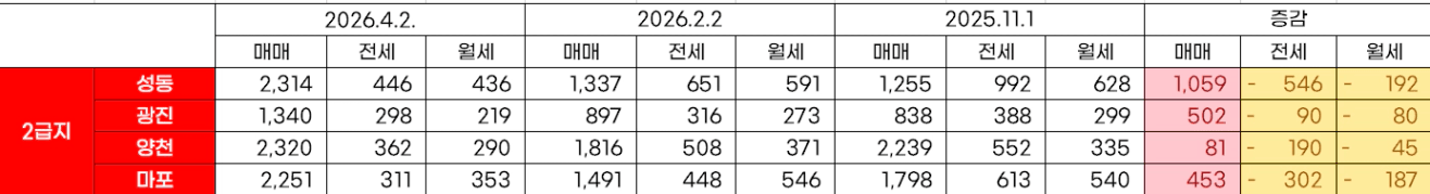 26년 4월은 2월과 비교해서 전월세 매물이 2,000개 정도 감소했습니다.