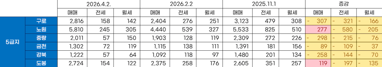5급지에서는 노원, 도봉구의 물건이 소폭 증가했습니다.
