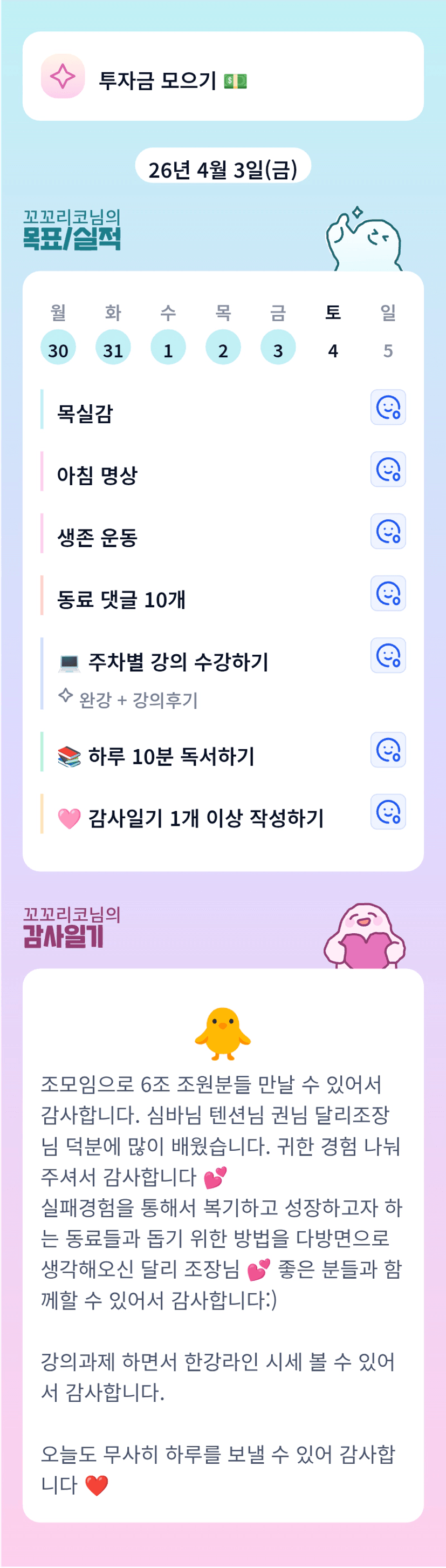 저도 꼬꼬님과 함께해 너무 반가웠습니다~~ㅎㅎㅎ 정신 없는 와중에 조모임 내용 엄청나게 꼼꼼하게 정리해 공유해주시고 중간중간 챙겨주셔서 너무 감사합니다 꼬꼬님!!!💛💛💛