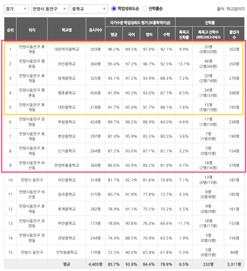 동안구에 위치한 총 15개 중학교 중 임곡중학교까지 9개 중학교가 80% 이상의 성취도율을 기록하고 있어요.