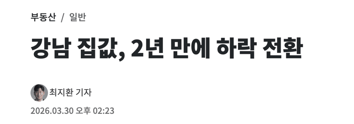 실제로, 3월 기준 강남구 아파트값은 -0.16% 로 2년 만에 하락 전환했어요. (KB부동산 기준)