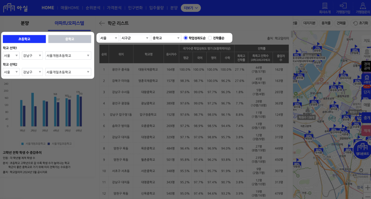 좌측에서 초등학교 vs 중학교별 비교도 가능해요!