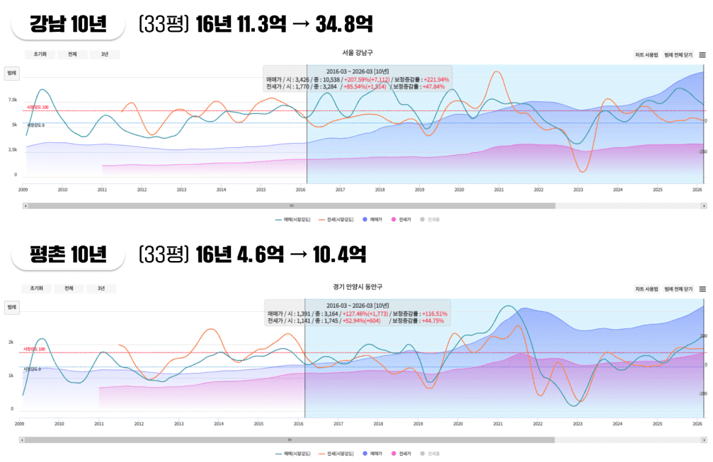 즉, 강남이 평촌보다 훨씬 더 빠르게 올랐다는 뜻이에요.