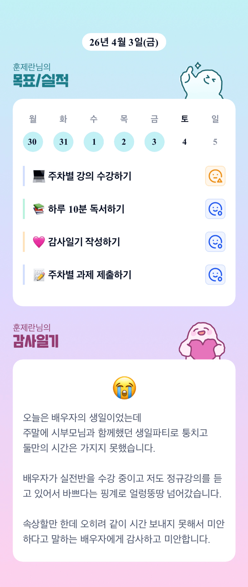 남편분 실전반 수강하고 계시군요..🥹생일임에도 미안하다 말하는 남편분 넘 서윗하시네요 ,, 주말엔 해피 연휴 보내기를~~~😌😌