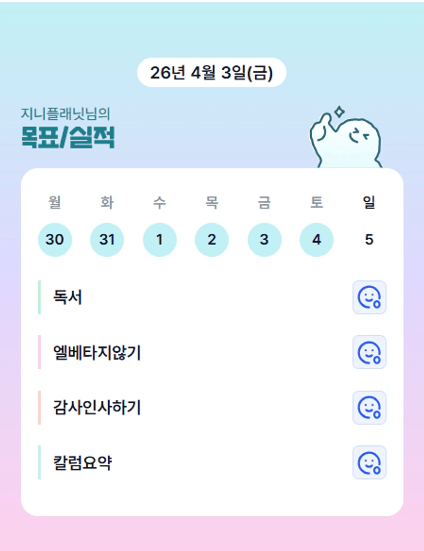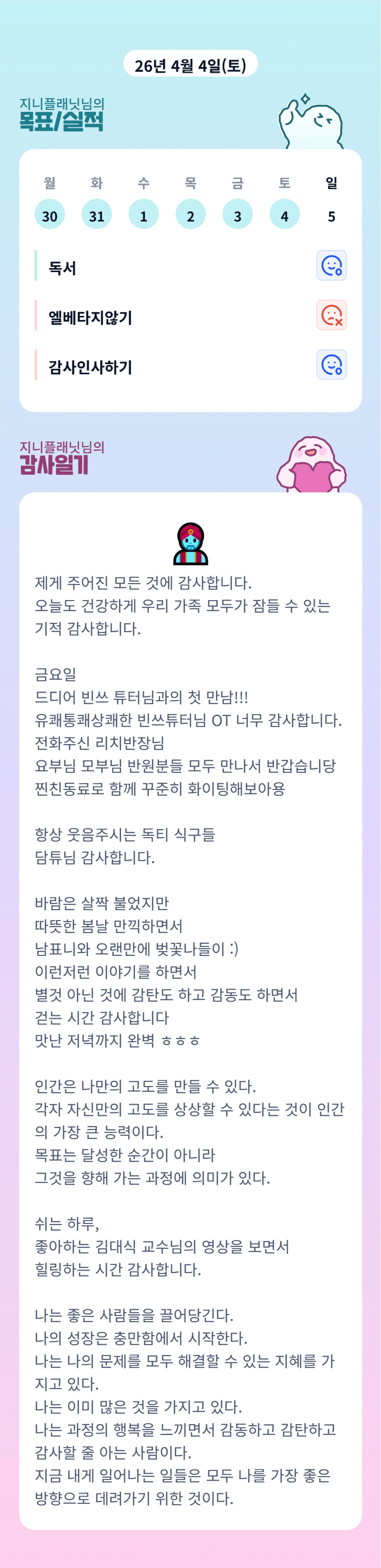지니 조장님은 이미 많은 것도 이루고 그럴 자격도 있어욤 ㅎㅎ 봄학기도 우리 잘 끝내용 !!