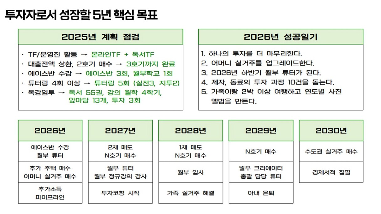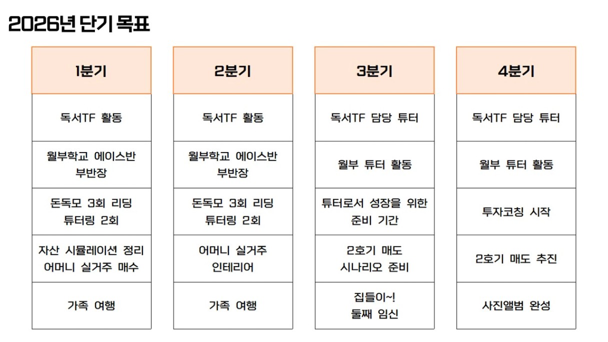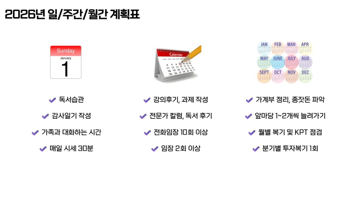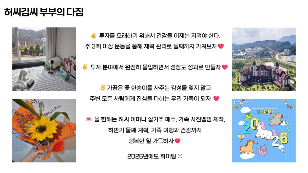 2026년의 핵심 목표는 ‘성공일기를 모두 이루는 사람’입니다. 투자자로서 남편으로서 몇 가지 목표를 세웠었는데요. 5가지를 모두 이뤄내는 사람이 되겠습니다.
