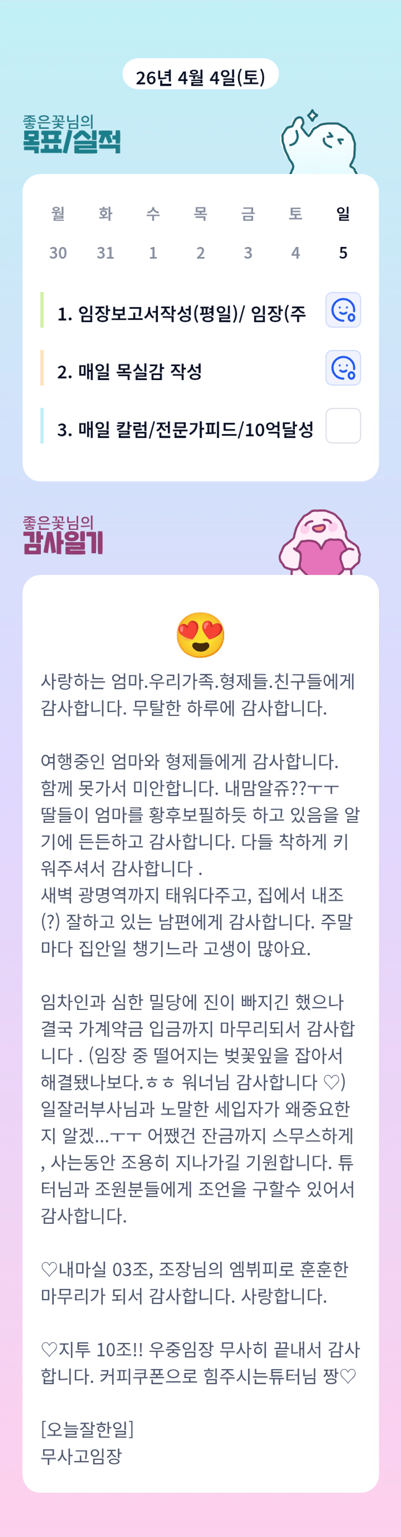 어제 임장내내 전화 하시느라 넘 고생 많으셨어요 ㅎㅎ 무탈하길 바래봅니다