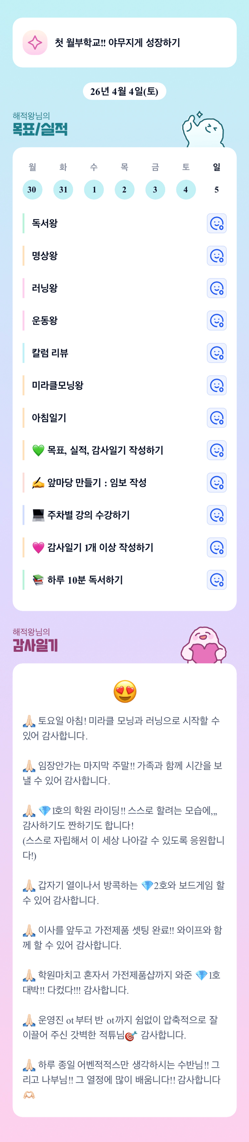 루틴 완벽하게 해내시다니!! 적왕님 역시 멋지십니다~ 이사 잘하시고 봄 학기도 화이팅입니다^^