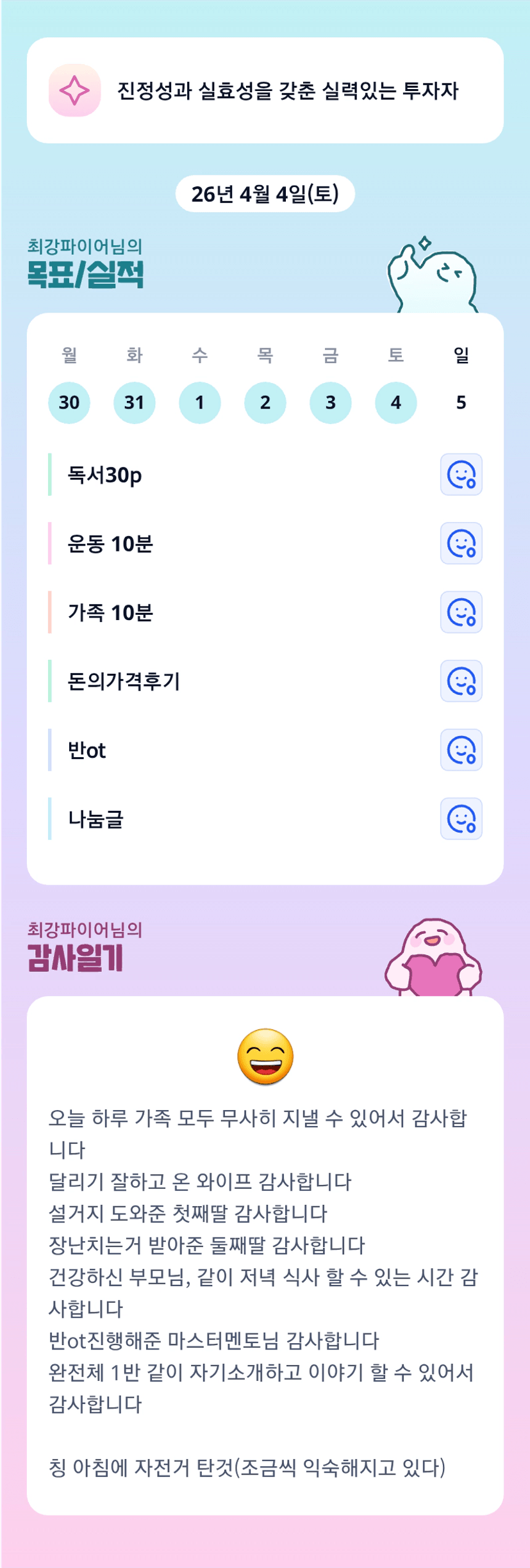 와 목표/실적 모두 완료하신 최파님 멋지십니다! 멀리서 오고 가시는데 ㅠㅠ 어디서 힘들다 하지 않고 잘 따라가겠습니다♡