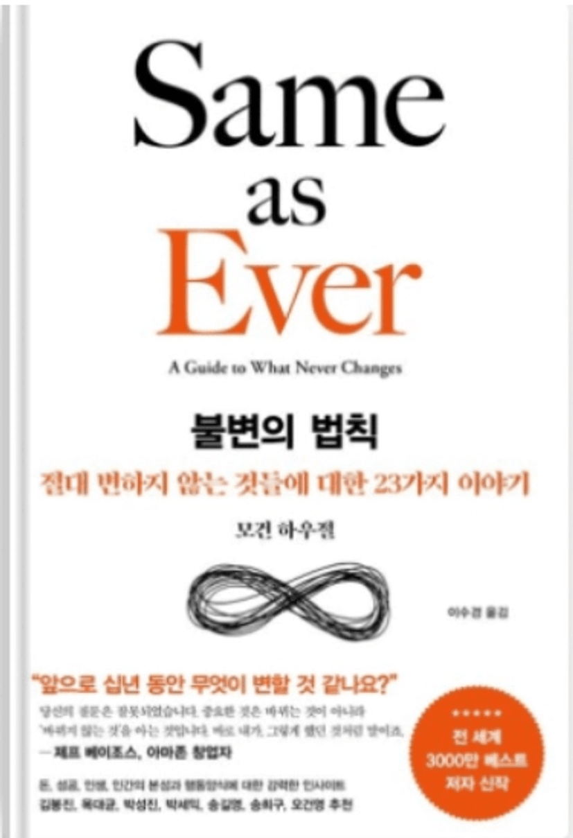 : 돈의 심리학으로 유명한 모건 하우절의 책이다. 이 책은 변하지 않는 인간 불변의 법칙을 이야기 하고 있다. 세상은 빠른 속도로 변화고 있지만 그 안에서 변하지 않는 것들을 앎으로써 좀 더 지혜롭게 세상을 살아갈 수 있게 한다.