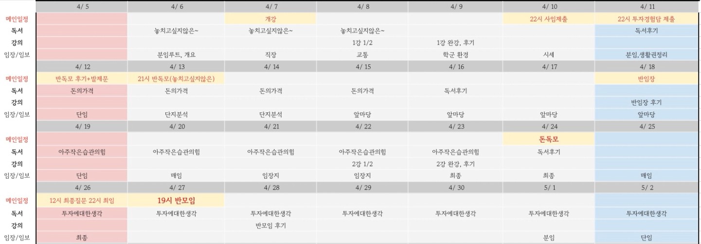 2월달에는 그래도 주말마다 임장을 갔는데 3월은 쉬었다. 자실은 나와 맞지 않는다는걸 다시 한번 확인했던 한달이었다. 쭉 강의를 들어와서 이제는 독강임투가 어느정도는 익었다고 생각했는데 역시 나는 환경에 있어야 하나보다. 계획했던 임장을 해내진 못했지만 대부분의 주말을 짝꿍과 보내며 가족에게 집중할 수 있었던 한달이었기에 게을렀지만 알찼다고 볼수도 있을 것 같다.