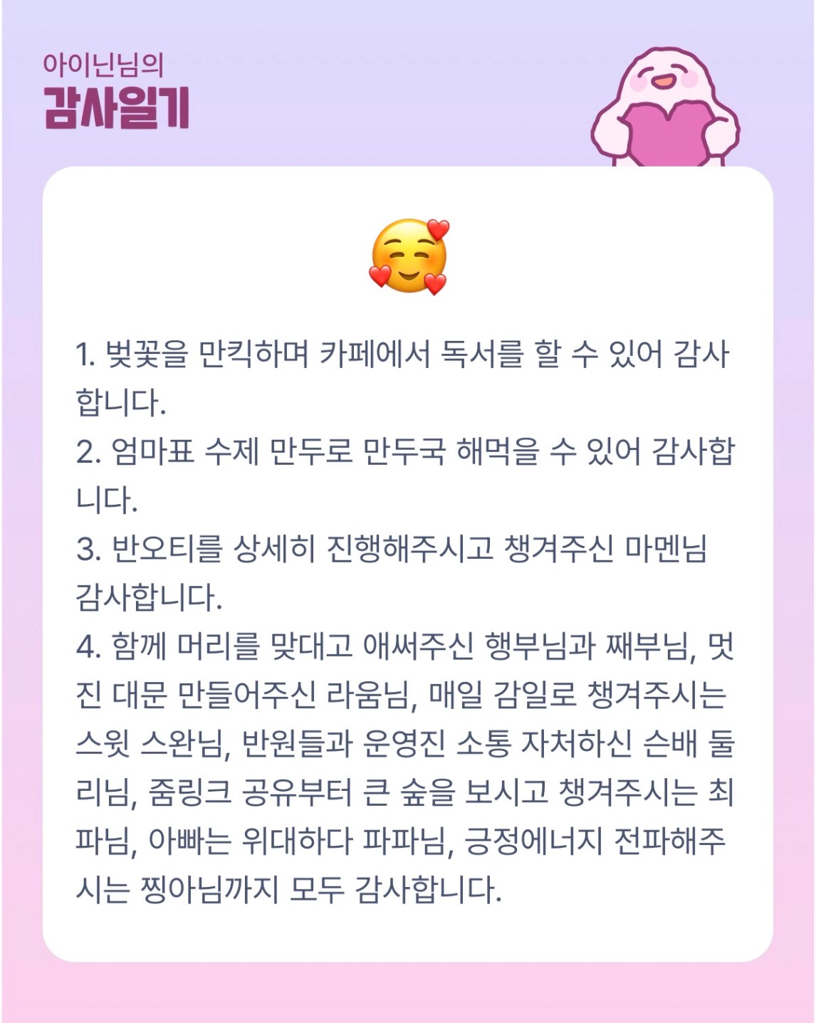 벚꽃을 보며 독서라니 저는 책이 눈에 안들어오던데👀👀 여윽시 닌장님은 다르다!!ㅌㅋㅋㅋ 3개월 동안 주구장창 머리를 맞대봐용★